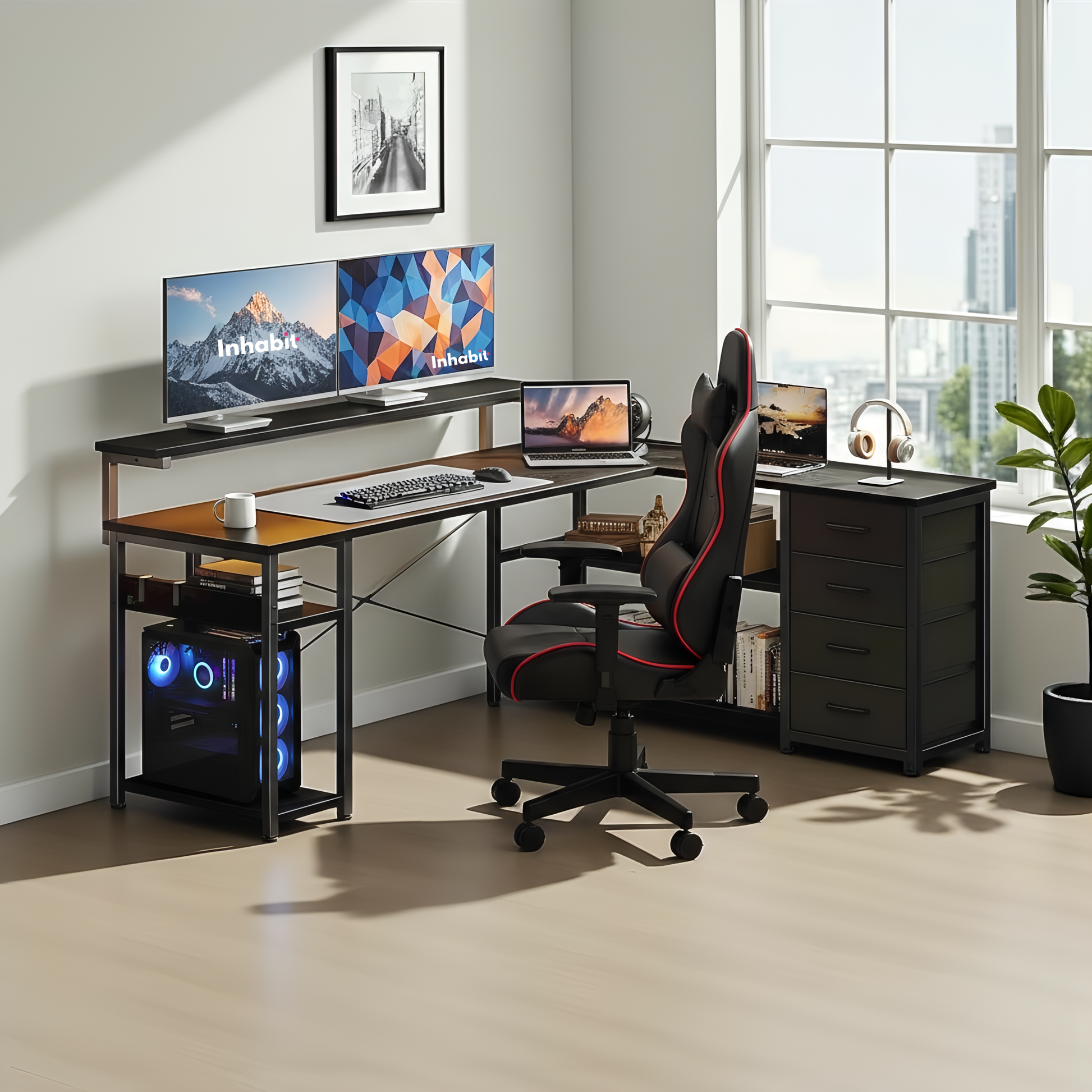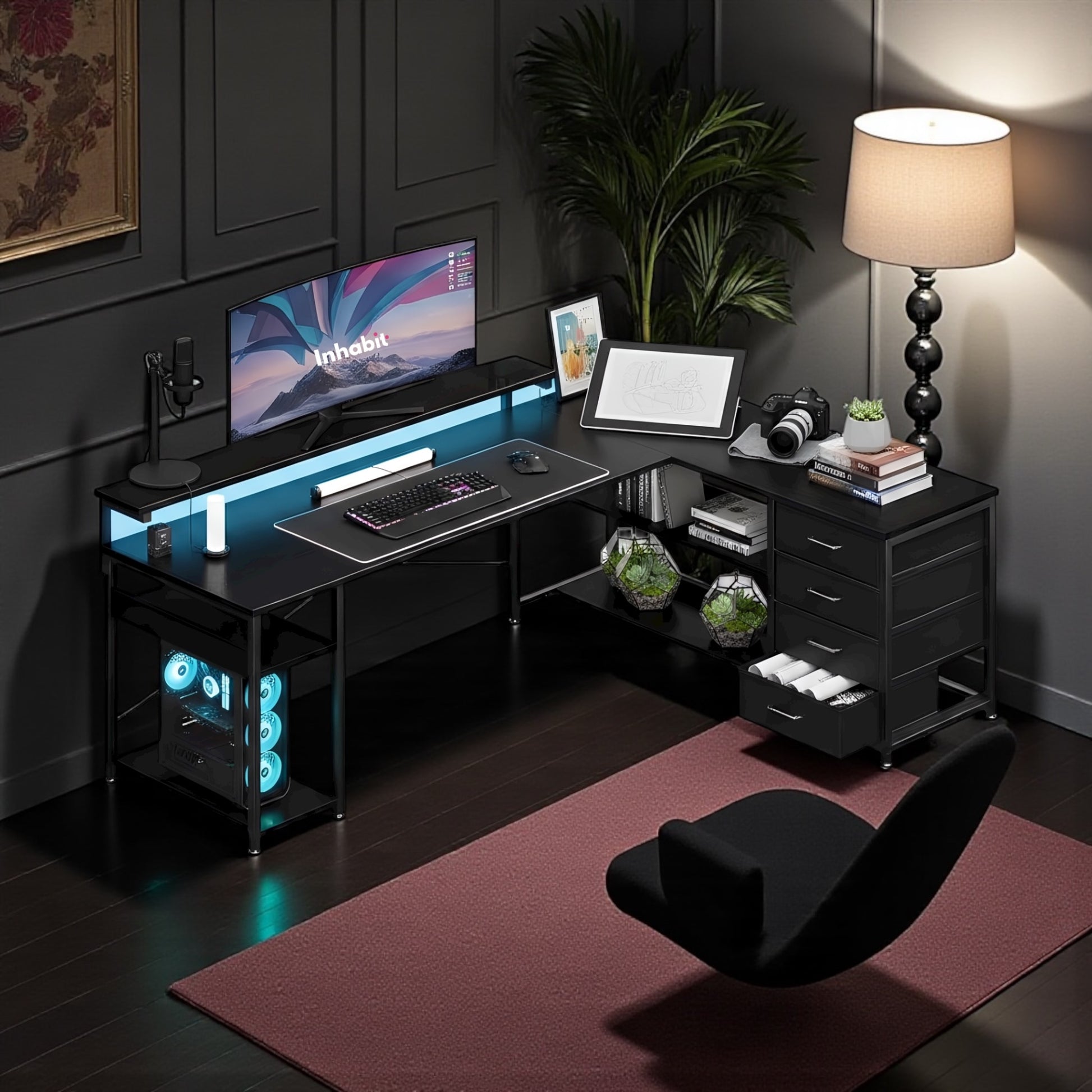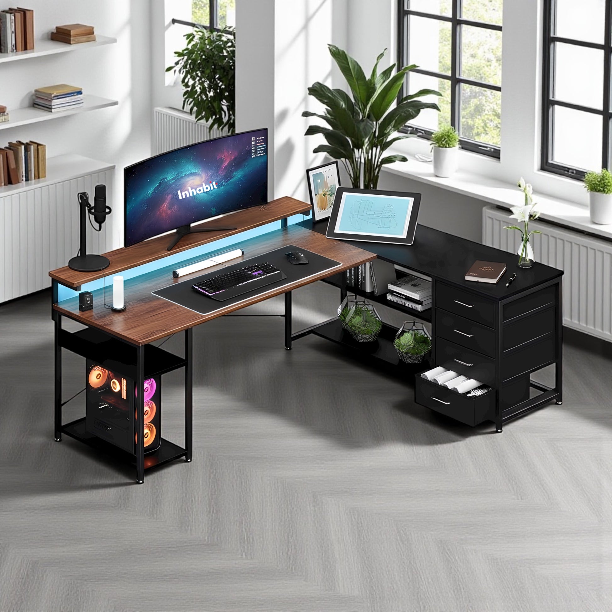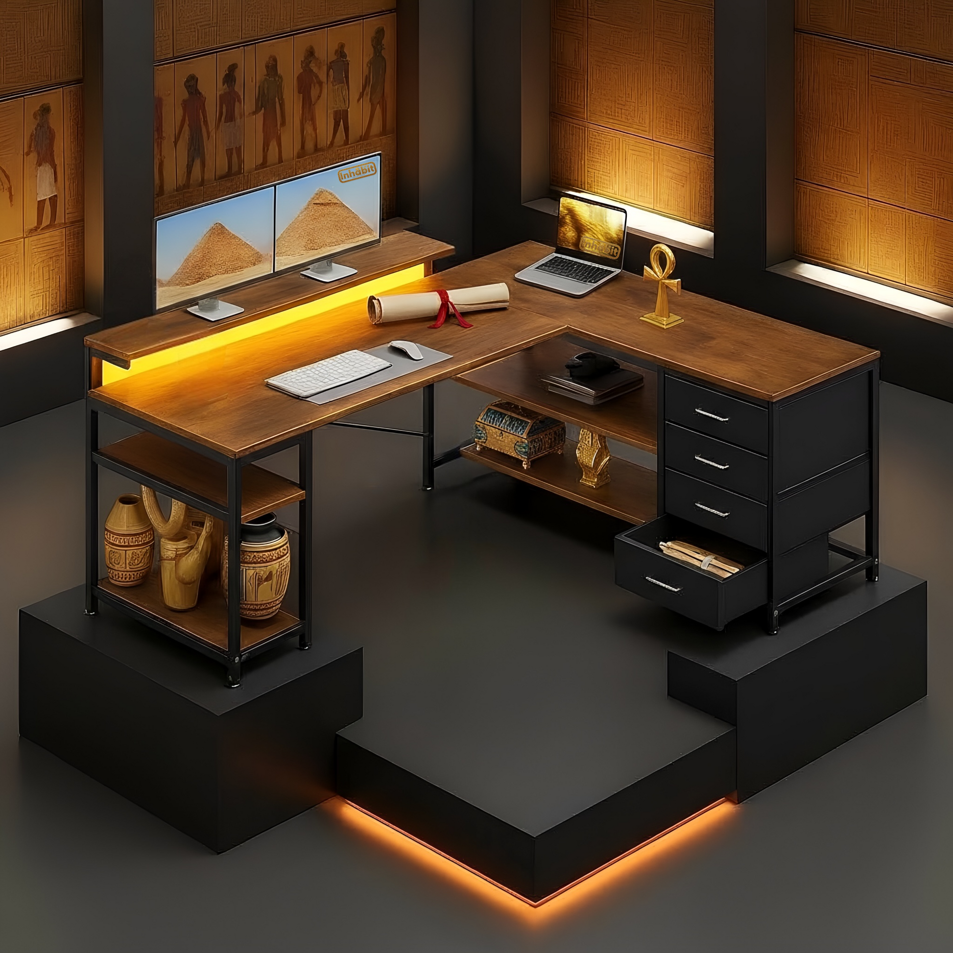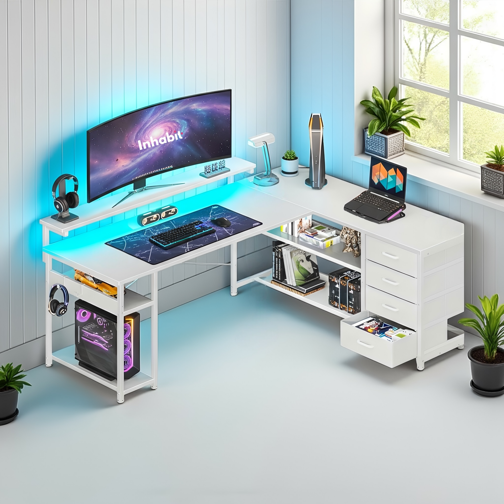مكتب تخزين مرتفع على شكل حرف L مقاس 135 سم مع مصدر طاقة مدمج ومصباح LED